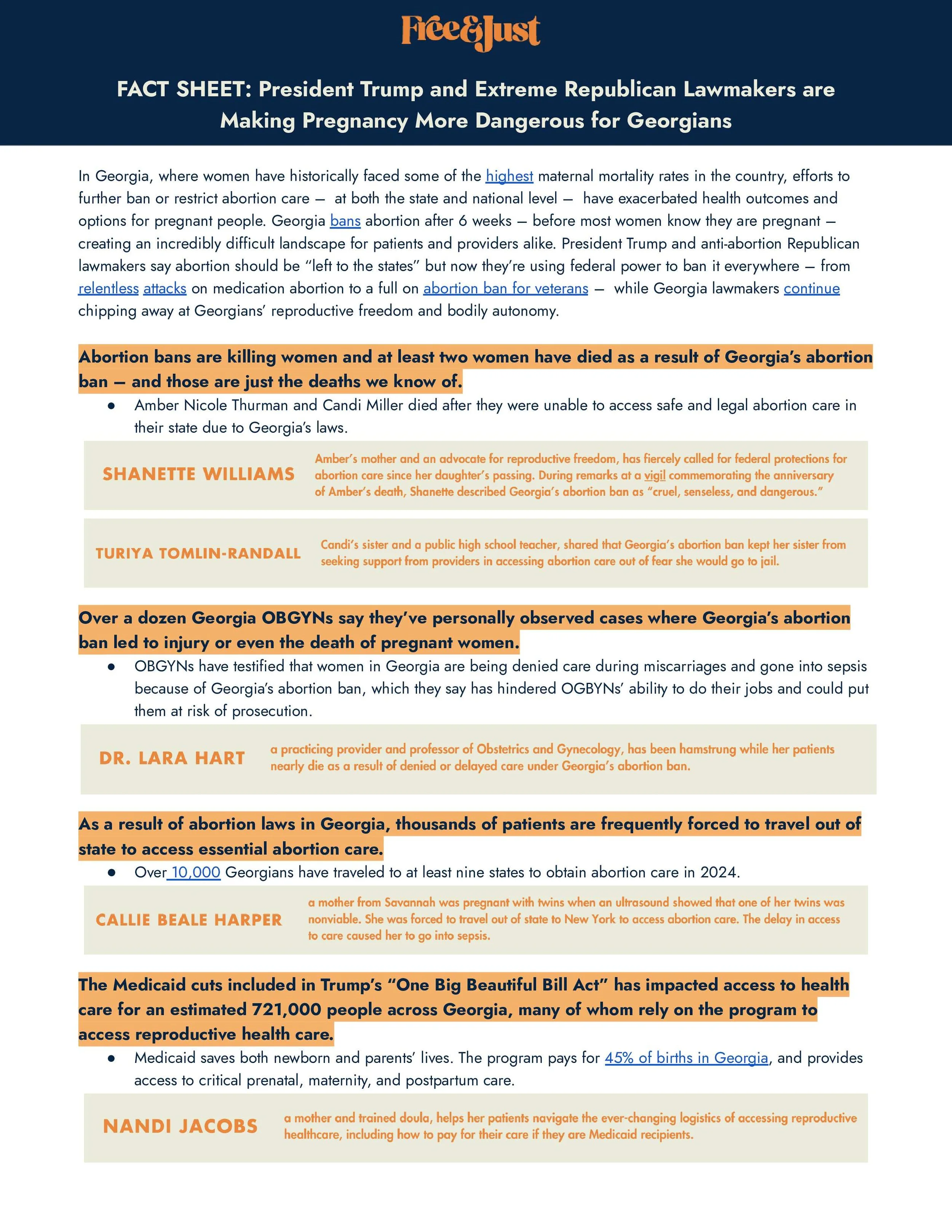 In Georgia, where women have historically faced some of the highest maternal mortality rates in the country, efforts to further ban or restrict abortion care – at both the state and national level – have exacerbated health outcomes and options for pregnant people. Georgia bans abortion after 6 weeks – before most women know they are pregnant – creating an incredibly difficult landscape for patients and providers alike. President Trump and anti-abortion Republican lawmakers say abortion should be “left to the states” but now they’re using federal power to ban it everywhere – from relentless attacks on medication abortion to a full on abortion ban for veterans – while Georgia lawmakers continue chipping away at Georgians’ reproductive freedom and bodily autonomy.